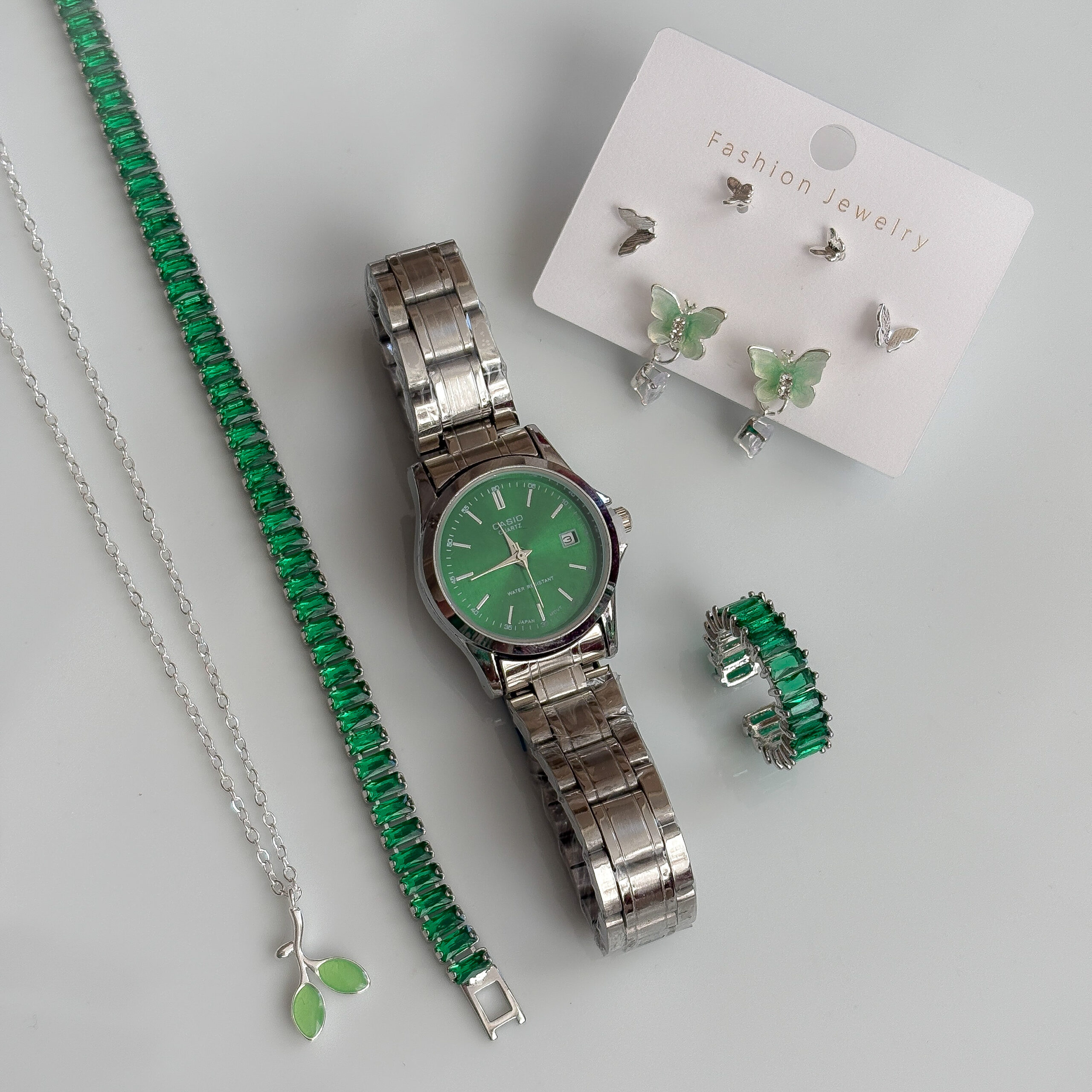 انگشتر, پک گوشواره, دستبند تنیسی, ساعت, گردنبند جوانه